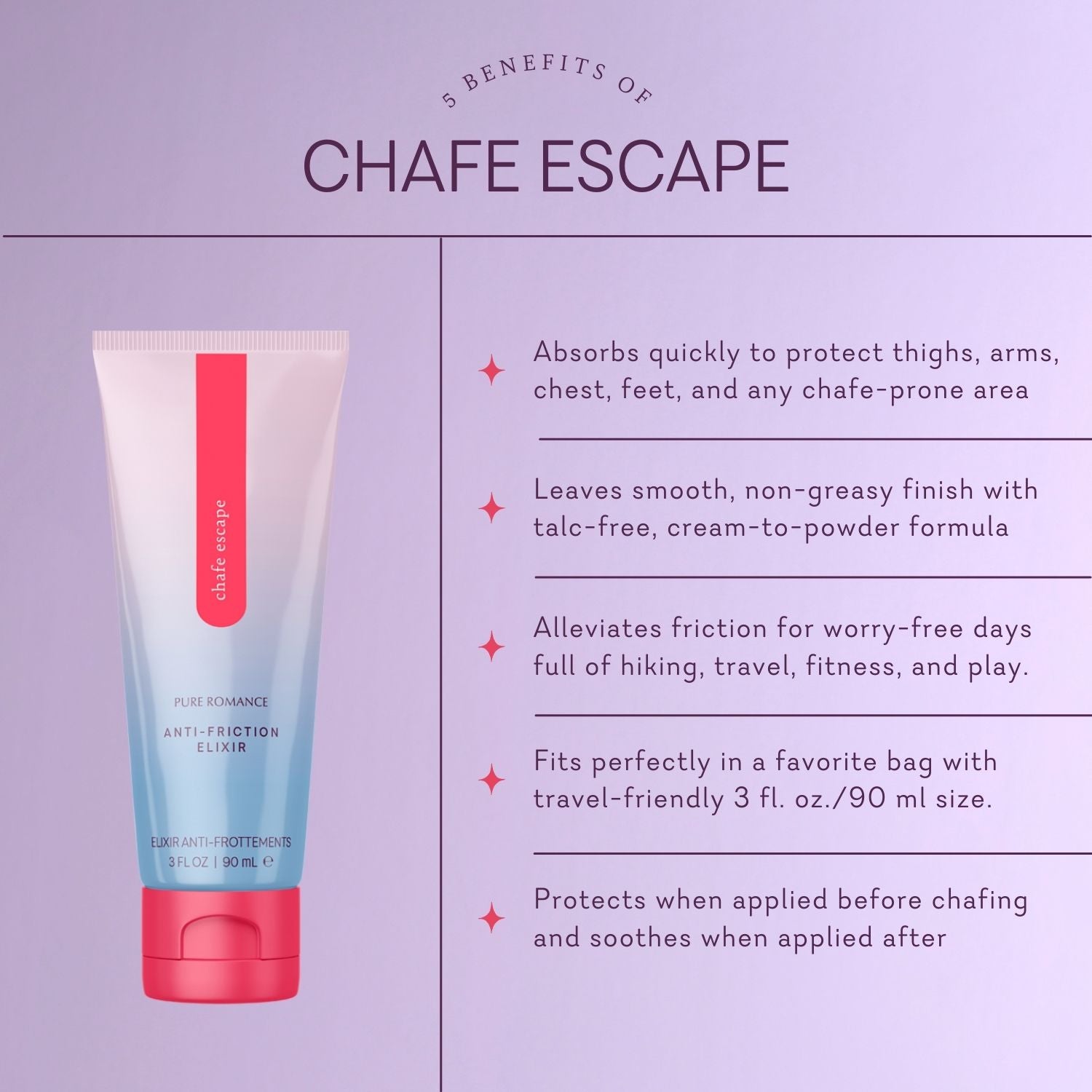 Ready to feel cool, comfortable, and confident? Experience the refreshingly smooth sensation of Chafe Escape. This protective cream to powder formula is filled with soothing botanicals that make it a must-have. It’s perfect for easily irritated areas like your thighs, arms, and nipples. Simply apply as needed to transform problem areas into smooth, dry skin.