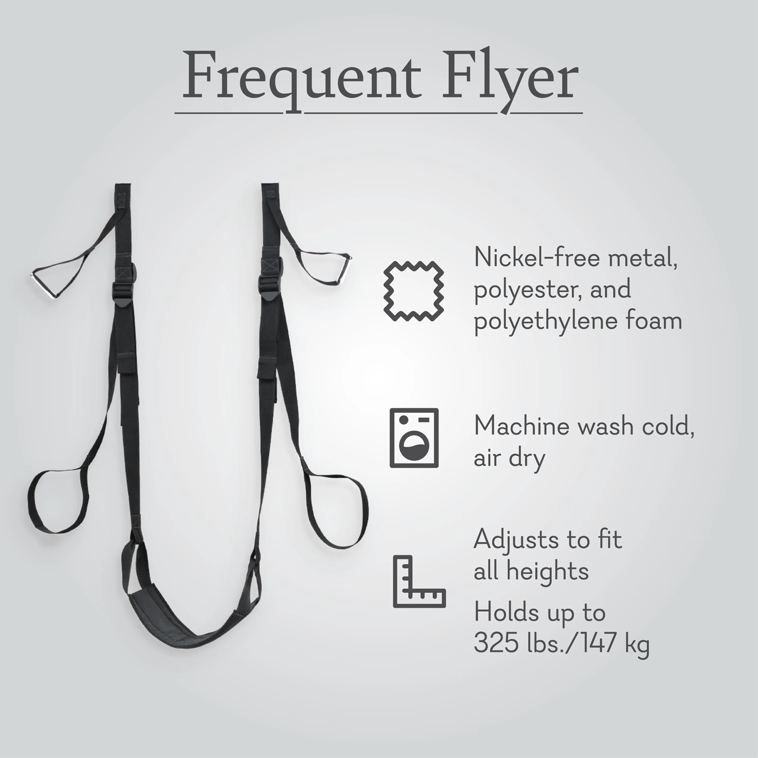 Welcome aboard your non-stop flight to paradise. The Frequent Flyer Door Swing fits in any doorframe for bedroom acrobatics that’ll take partner play up to a whole new level. Have a seat, position the straps, and you’re ready for take-off. Move in ways you never imagined or ask your co-pilot to take hold of the seat to angle your hips for ultimate satisfaction. Your Mile-High Club membership awaits.